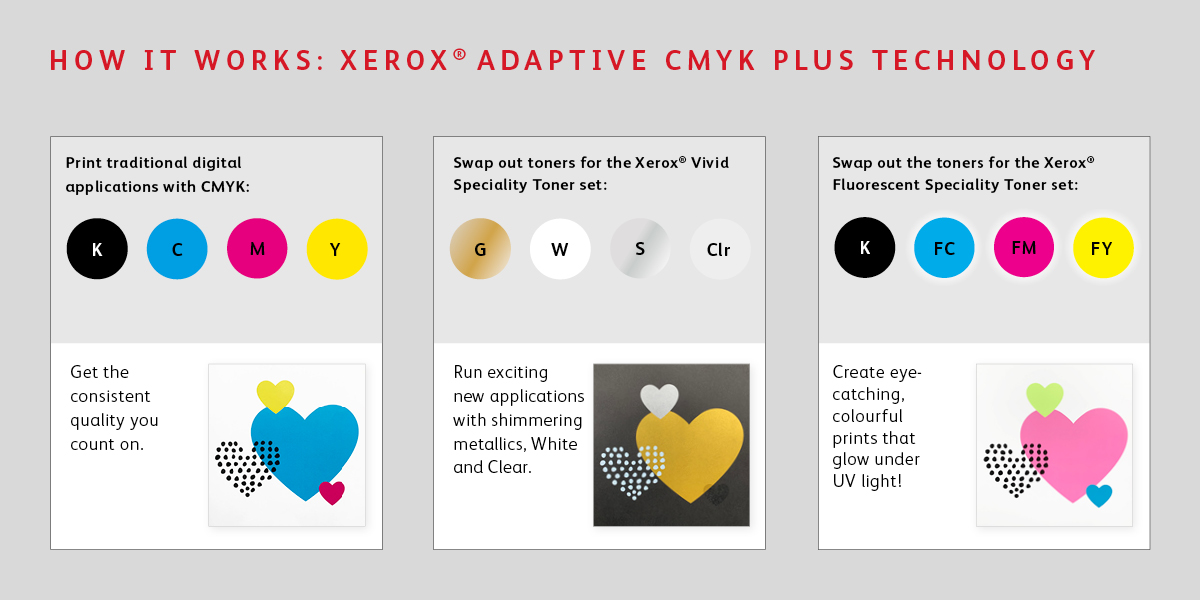 To Xerox® Adaptive CMYK Plus Kit προσθέτει γυαλιστερά μεταλλικά, έντονα λευκά και λαμπερά fluorescent χρώματα στις πρέσες Versant® 180 και PrimeLink® C9065/70, επεκτείνοντας την παλέτα σας σε περισσότερα από ένα εκατομμύριο χρώματα, χρησιμοποιώντας 11 νέα τόνερ.