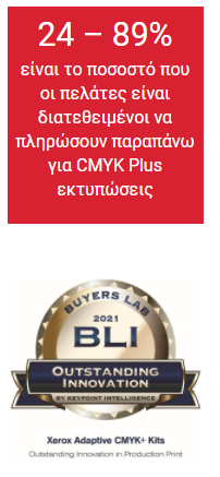 Η διαθεσιμότητα του Xerox® Adaptive CMYK Plus Kit στα Versant 180 και PrimeLink C9065/C9070 επεκτείνει την τεχνολογία CMYK Plus σε όλη τη γκάμα των προϊόντων μας. Χωρίς να αντικαταστήσουν την πρέσα που έχουν ήδη, χιλιάδες κάτοχοι Versant και PrimeLink μπορούν πλέον να προσφέρουν εκτυπώσεις που προσελκύουν ακόμη περισσότερο την προσοχή.
